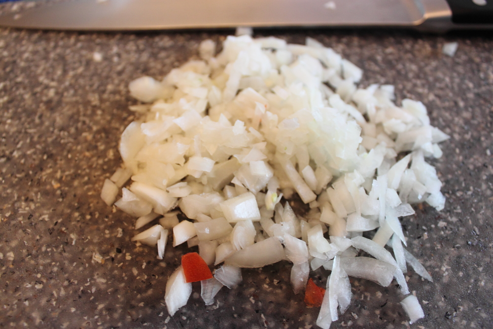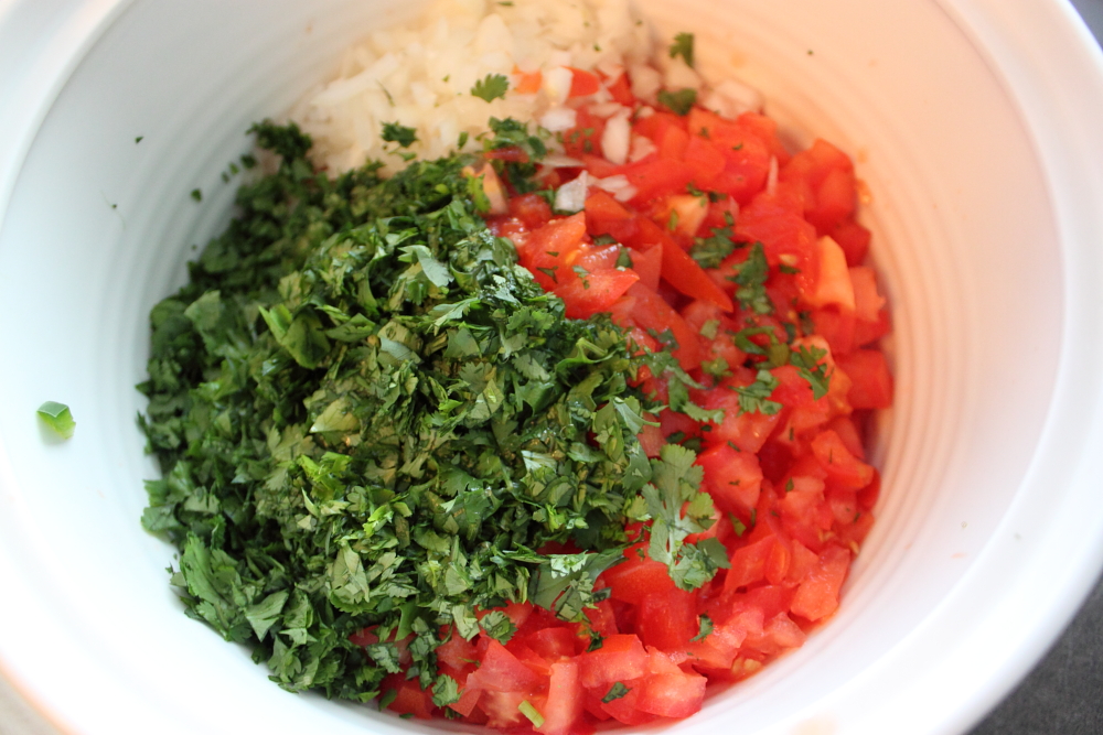I like to start making the salsa by chopping up the Jalapeño peppers. I reduced the amount of peppers asked for in the recipe because I never know who can’t handle the heat. A great way to reduce the contamination of the spicy juices often left on your fingers is cutting it with gloves. Right after cutting, toss the gloves away! And remember not to rub those eyes!! I’ve learned that the hard way. For extra heat, leave the seeds and the white membrane when dicing the peppers. I took them out for a mild salsa.