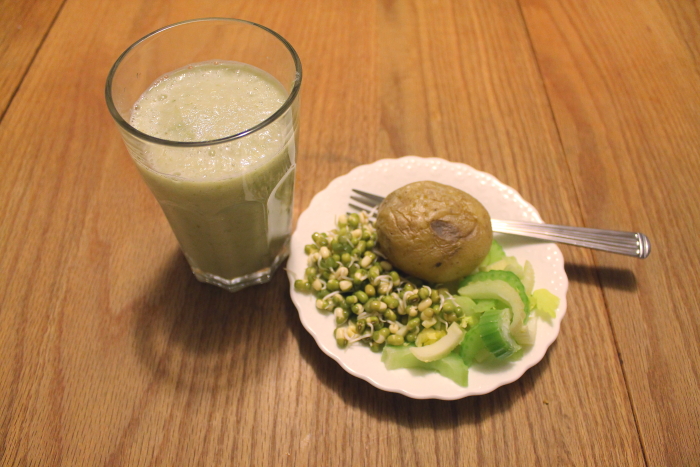 Day 1: Feeling tired. I am not allowed any coffee. I ate potato and sprouts with Tarzan Juice in the morning. For lunch, I ate iceberg lettuce and mung bean sprouts with Tarzan Juice. I snacked on banana and papaya (which is also good for eczema suffers). For dinner I had the chickpea casserole and salad and Tarzan juice. By the end of the day I had a huge head ache I think from caffeine withdrawal.