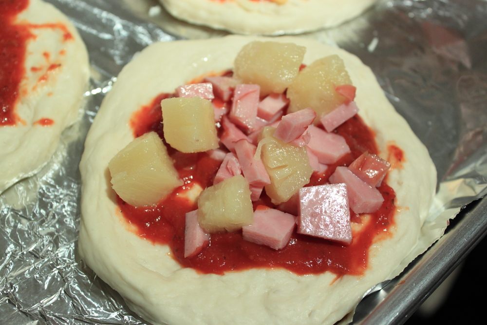 While the dough is resting, prepare the filling. Choose your favourite pizza topping. For these pizza pockets, I filled one with hawaiian (ham and pineapple) and one with spinach, mushroom and cheese. When you choose raw veggies, make sure to cook them to soften them a bit because they won’t cook fully in the dough.