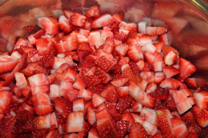 Begin by chopping the strawberries into tiny chunks. You want to be able to put them into the pie shells.
