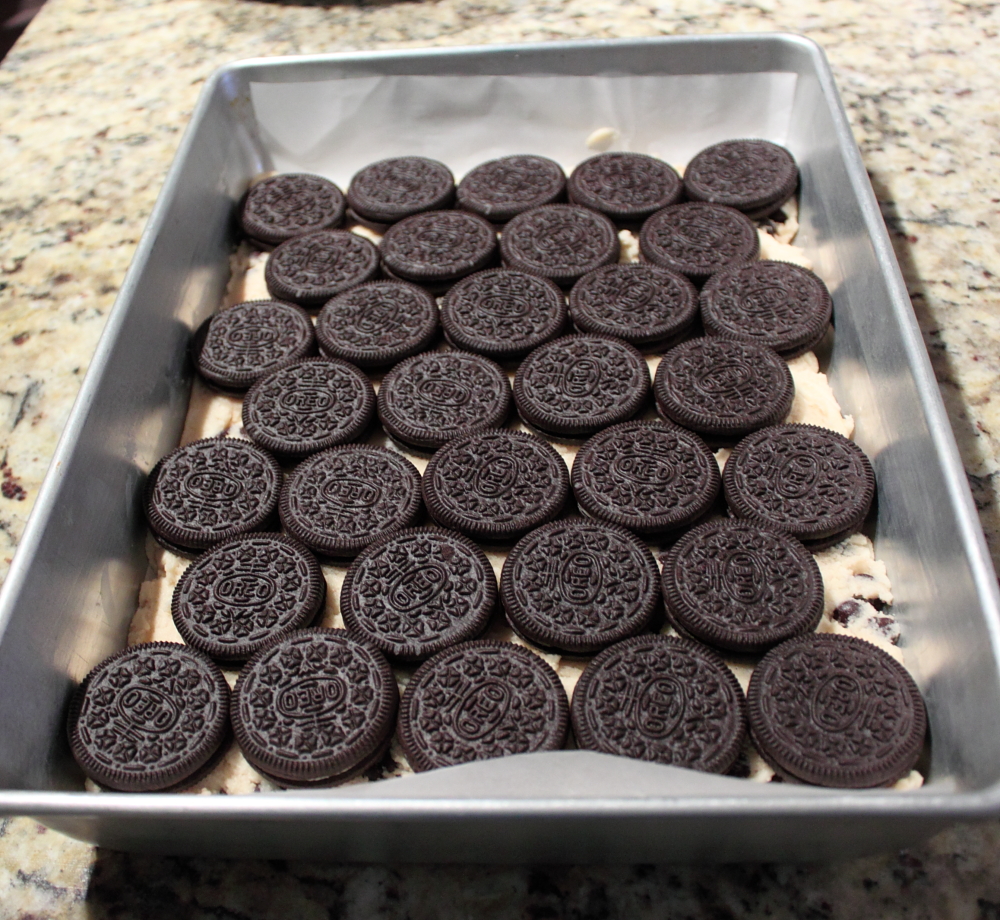 - Layer as many oreos that will fit on top of the cookie dough. No need to overlap. One single layer will do.