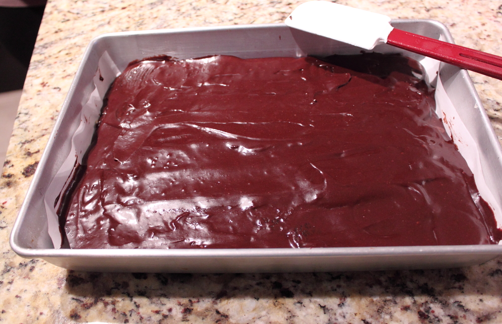 - In a medium sauce pan, melt the butter over medium high heat. Add the sugar and cocoa powder once the butter is melted. Whisk to combine and remove from heat. Add the salt, vanilla and eggs and continuously whisk until the eggs are combined. Add the flour and continue to mix. Set batter aside.