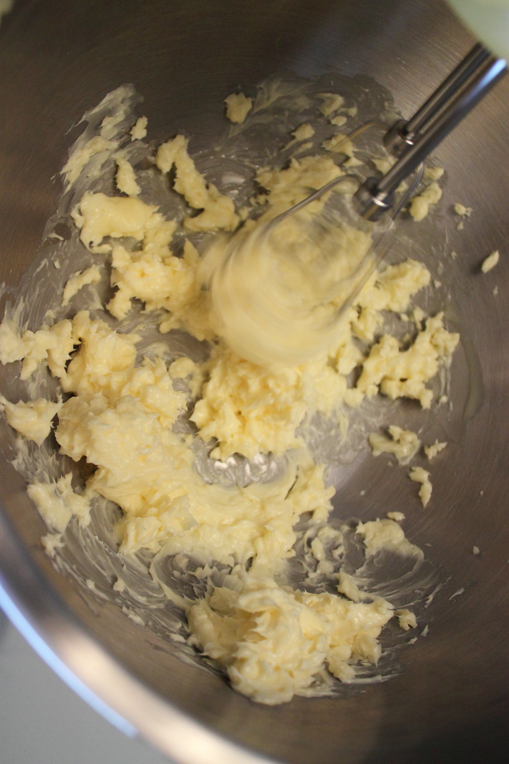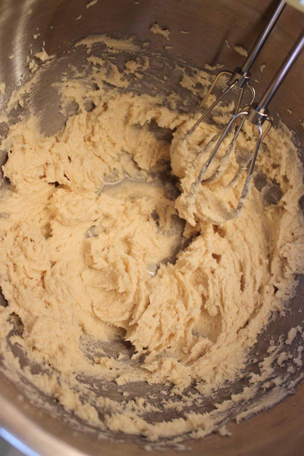 The next step is to make the cookie dough. Beat the room temperature butter (1/2 cup) until it is smooth. Slowly add 3/4 cup white sugar into the butter and then add the 1/4 cup brown sugar.