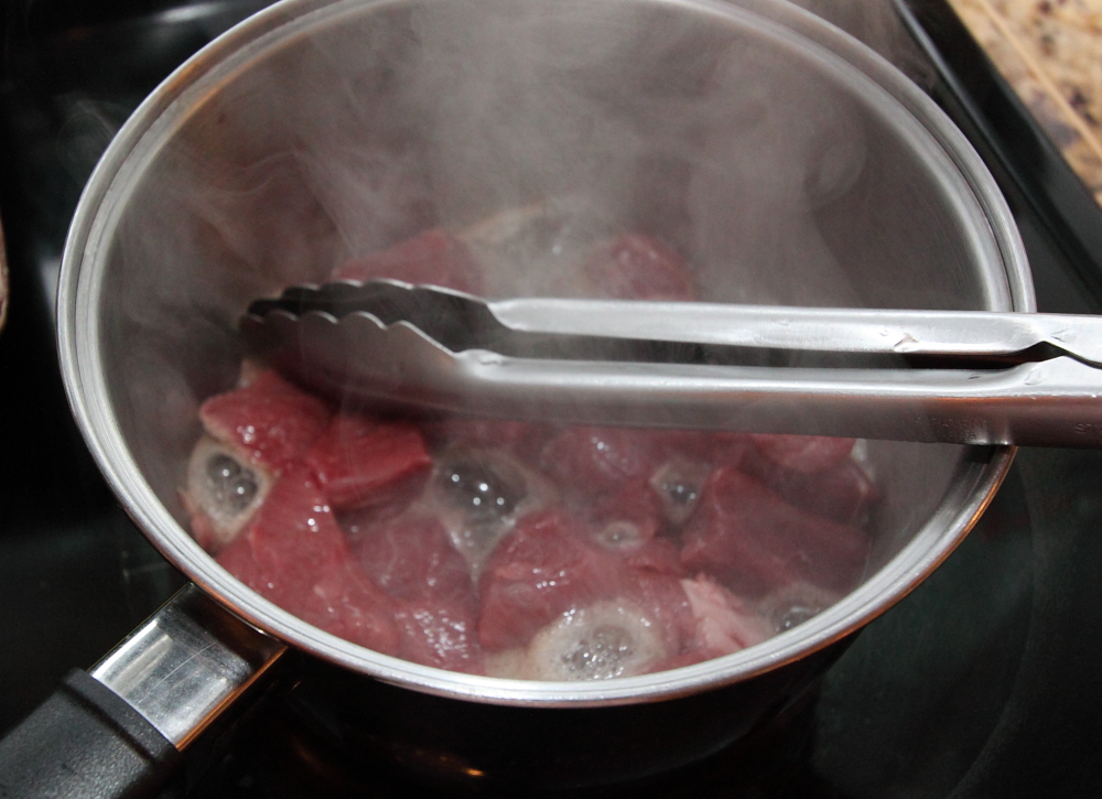 The first step is to sear some stewing beef. The sear will give the beef a nice crust. Make sure not to move the beef to quickly so that it has time to brown on each side. Another tip is to not overcrowd the pan. This will prevent it from browning properly (the picture below is overcrowded and I was disappointed with the browning).