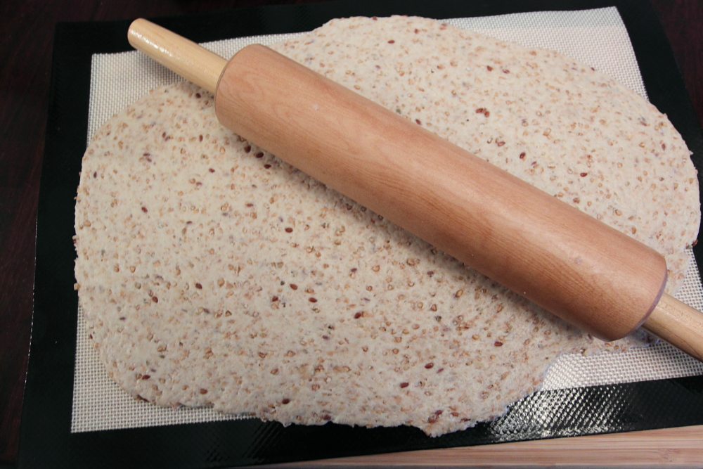 Take a small portion of the dough (about 1/4 cup) and roll it out on a Silpat or other nonstick baking mat using a rolling pin, until it is very thin.