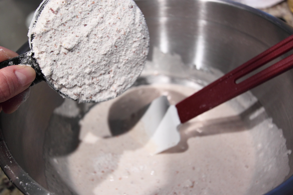Mix the sourdough starter and oil together until well combined. If the starter is cold, the coconut oil will solidify so try letting the starter sit until it has become room temperature.