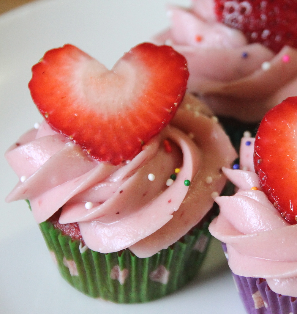 To cut the strawberries into hearts, cut out a V shape at the top. Slice the strawberry 90 degrees from V cut. To make the cupcake extra special you can add tiny sprinkles before adding the strawberry.
