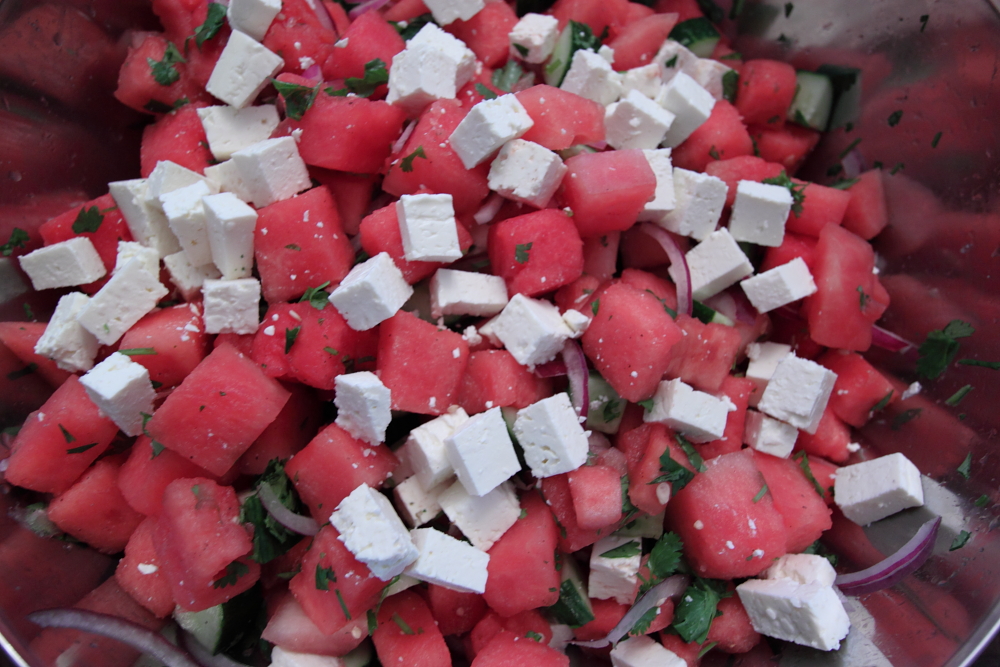 For the dressing, I use just lime, salt and pepper. Add the lime juice sparingly and try it out. Its better to add too little then too much. You can’t go back once you’ve added too much. (I’ve learned the hard way). Once everything is mixed together you get a very refreshing watermelon salad that is great for hot summer days.