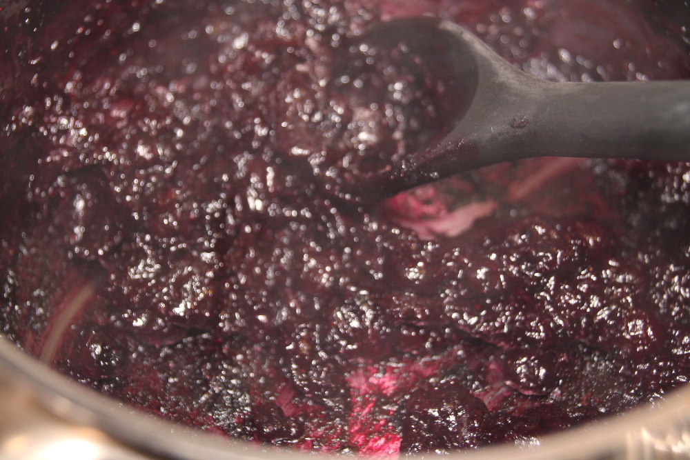 Pour about 1 1/2-2 cup of frozen blueberries. Make about 3/4 cup of paste. This took about half an hour. Place on medium heat and stir occasionally until it is reduced to a thick paste.