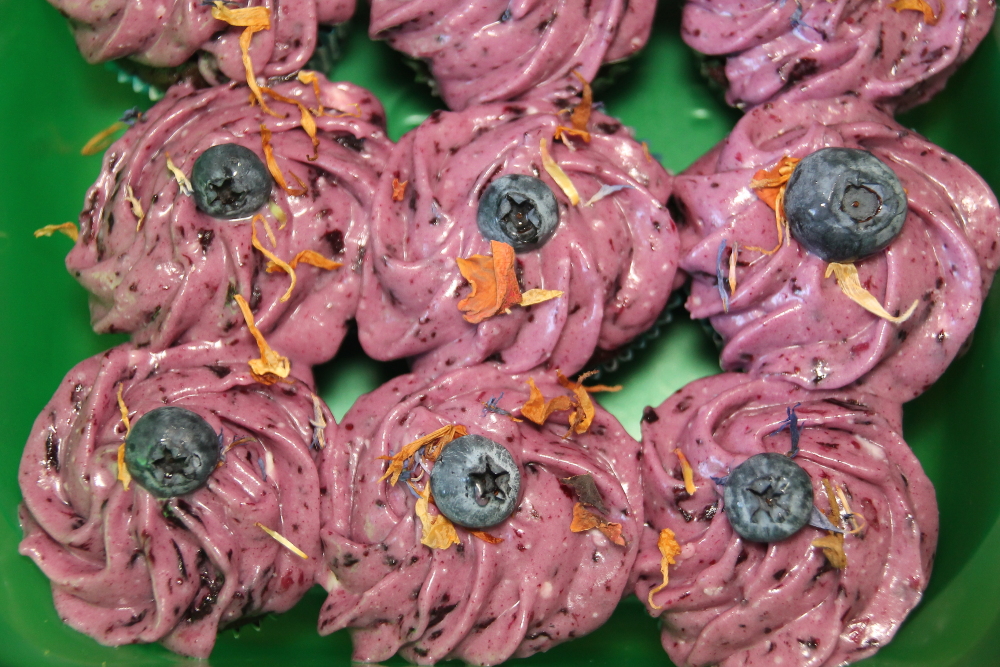 I decorated these cupcakes with edible blossoms and fresh blueberries. The results were wonderful. The blossoms added a slight floral property to the cupcakes.