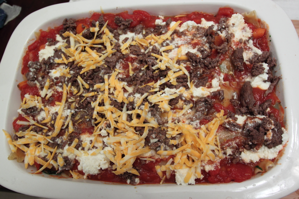 Add another layer of pasta noodles and repeat! There may not be anymore spinach but that ok because you already have a nice layer. At the very top, make sure you have a layer of tomato sauce (you don’t want the pasta to get hard when baking) and then add a nice thick layer of cheddar cheese.