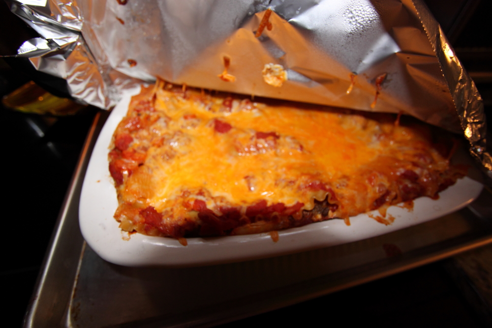 Bake in a 375 degree oven with tin foil for about 30 minutes and then uncover and bake for another 25-30 minutes until the tomato sauce bubbles and the cheese browns.