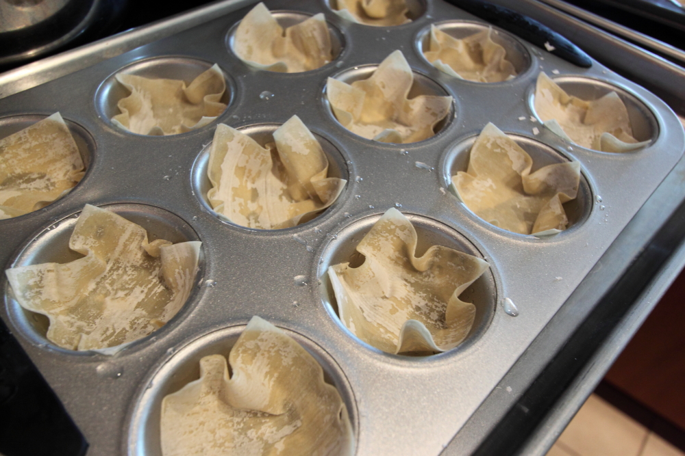 Start by putting some oil in a muffin tin. This will prevent the wonton wrappers from sticking to your tray. Place one wonton wrapper in each muffin spot.