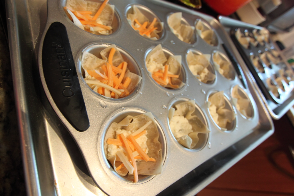 Bake in a 375 degree oven for about 30-40 minutes until the wrappers are brown and the cheese has melted. Let it cool for a couple minutes before you take it out of the tin.
