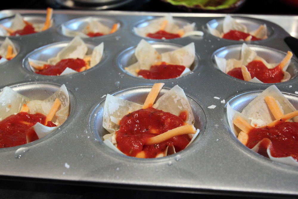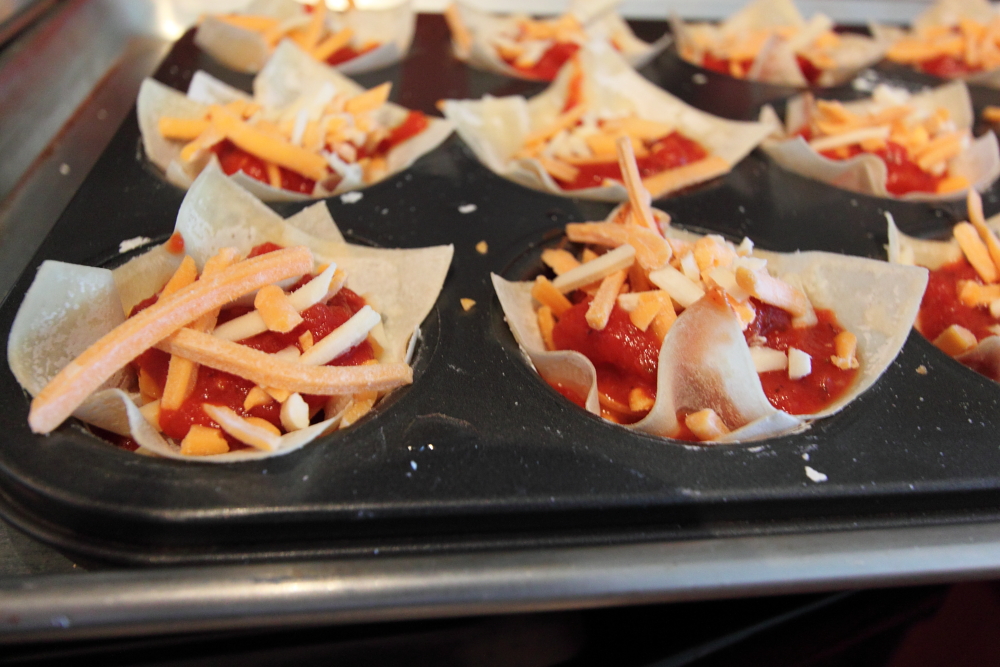To make these, I use wonton wrappers as the pasta and used canned tomato sauce. (I also bought pre-grated cheese) Easy!
