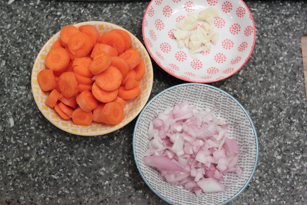 To create a home made traditional lasagna start by creating a quick and easy tomato sauce. I used some shallots, carrots and garlic as the base.