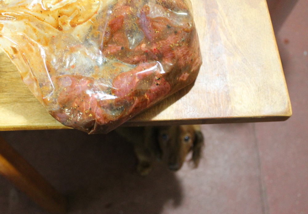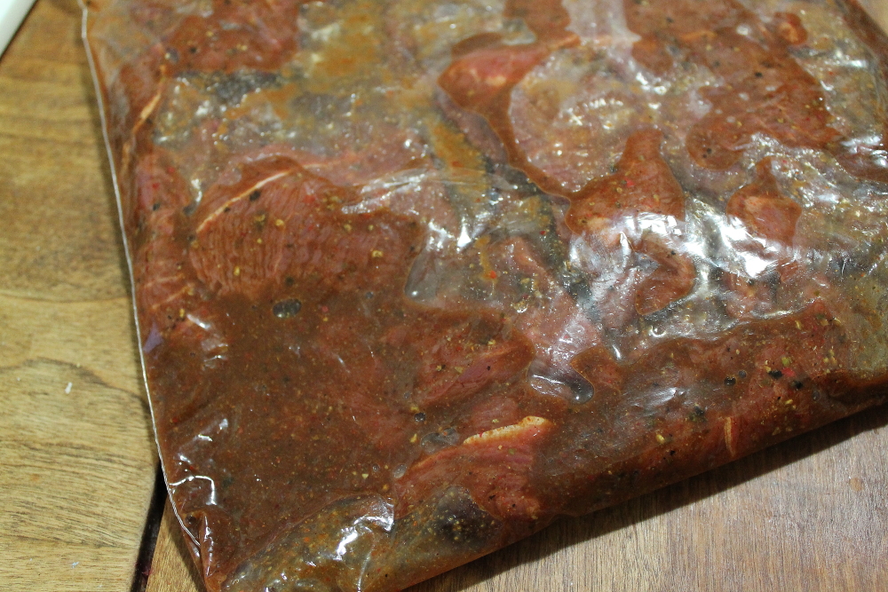 Place the marinade into a plastic bag or bowl. A bag works really well because you can squeeze all the air out and really saturate the meat with the marinade. Make sure you make plenty of marinade. The more the better and more flavorful the jerky. I try to make sure eat piece of meat is covered in enough marinade. Once or twice a day I mix the meat to make sure each piece gets lots of contact with the marinade.