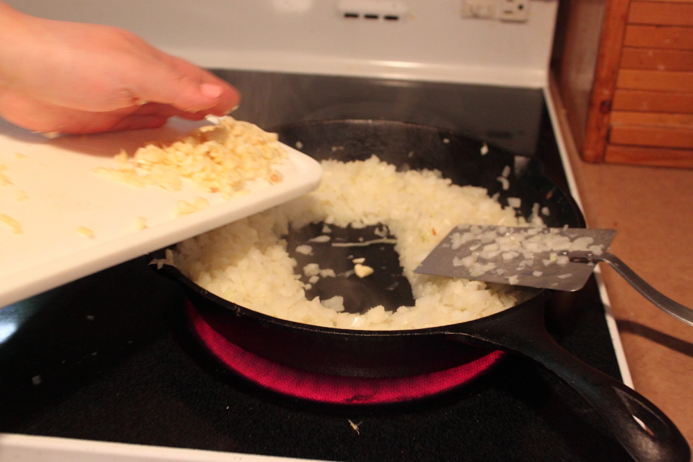 In a frying pan, sauté the onions until they are slightly tender. Add the garlic and simmer on low. Turn it off after a couple of minutes and set aside.