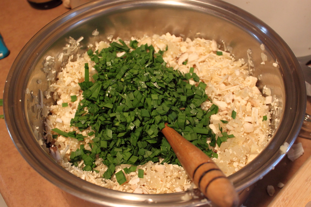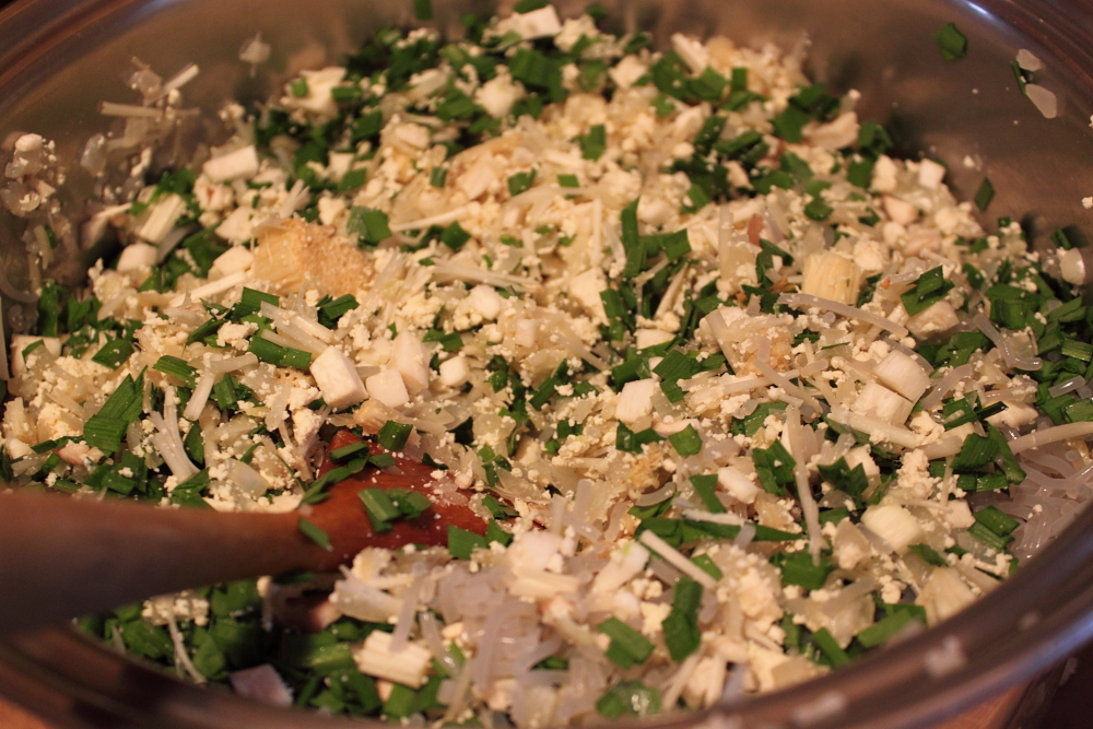 Chop 2 cups of kimchi and mix in with rest of the filling. Season it with a bit of sugar, salt and pepper.