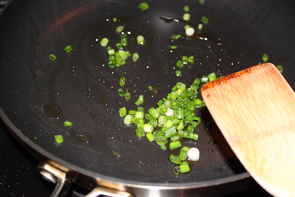 In a non-stick frying, heat up some oil and add the chopped onion. I used about 2 stems of onion. Leave some for garnishing. Cook the onion until it is lightly softened (~1 minute).