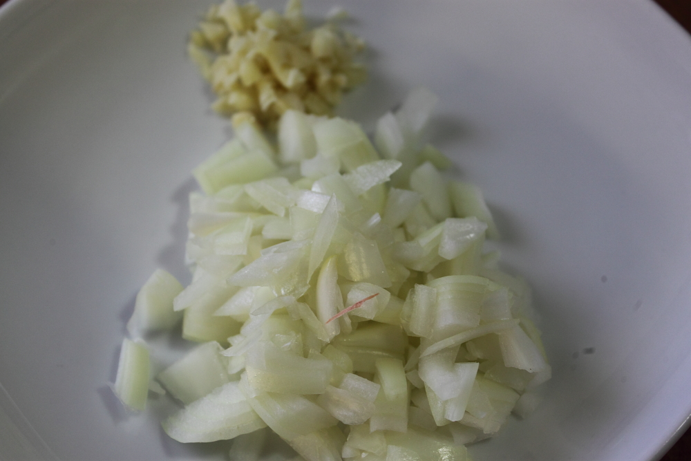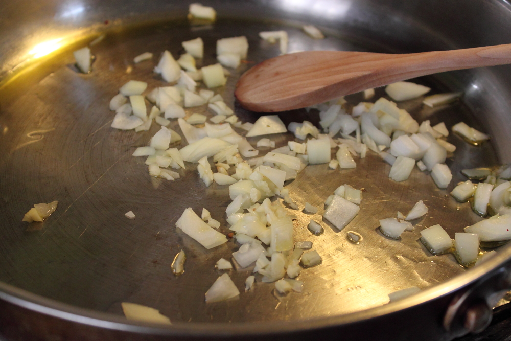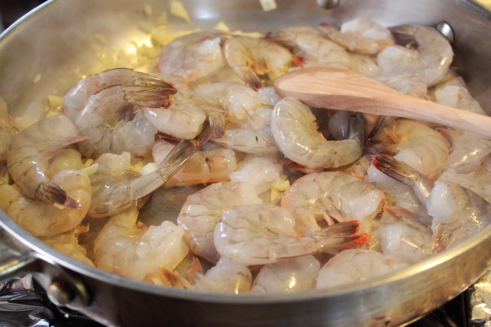 Chop a small onion and 3 cloves of garlic. In a saucepan, sauté the onions and garlic in some olive oil. Add some shrimp and cook until just pink.