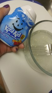 As soon as the sodium alginate mix with water, it will start to absorb the water making it turn into a gel consistency. At this point, you can mix in a flavoured drink mix. I’ve used Koolaid to flavour the gummy worms. Add about a Tbsp of the drink mix. Set aside.
