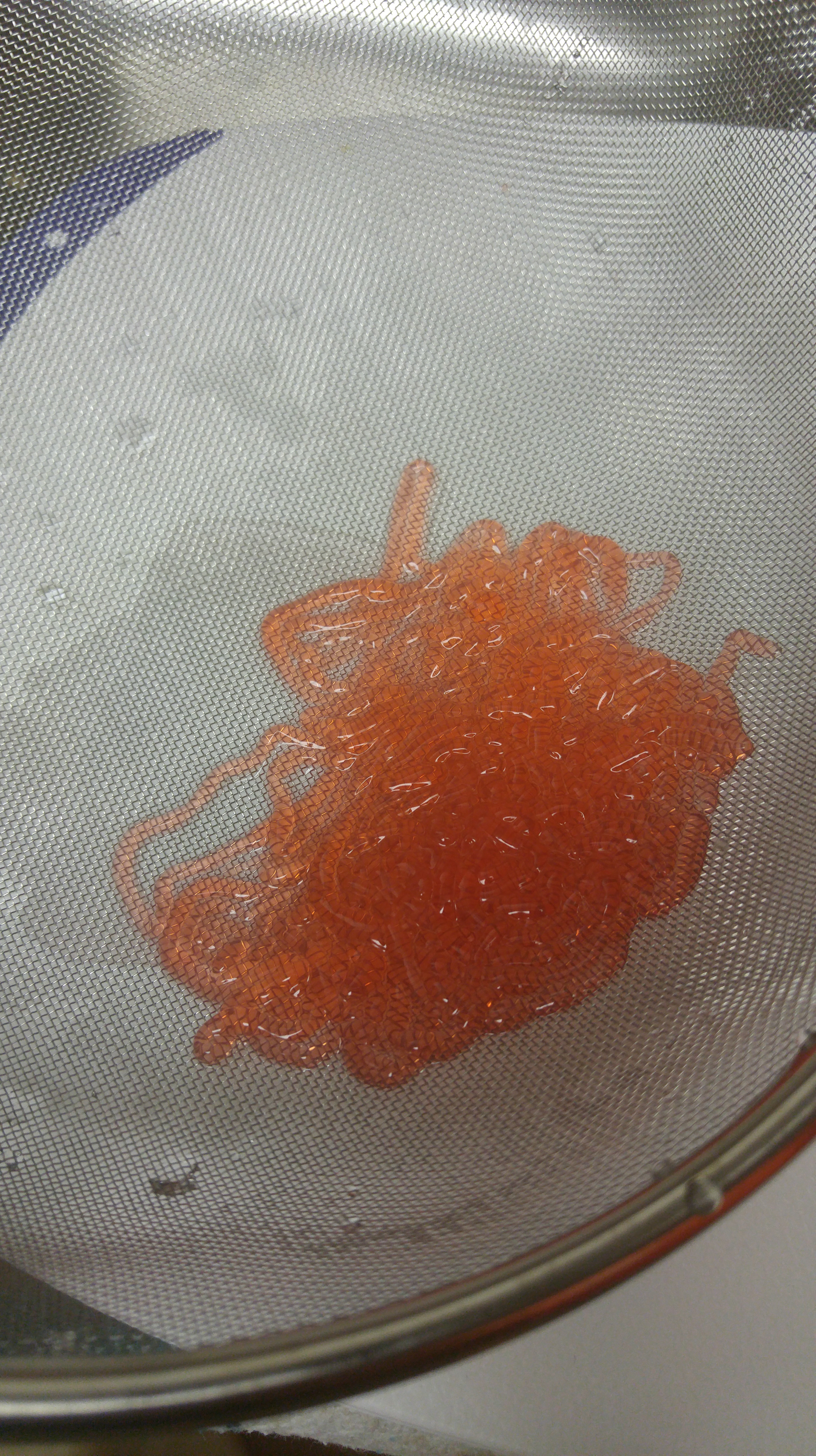 Now comes the fun part!! Fill a clean syringe or squirt bottle with the sodium alginate solution. Carefully squeeze a stream of the sodium alginate mixture into the calcium chloride solution.