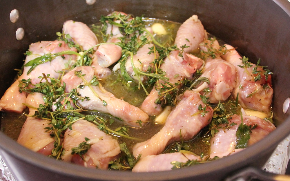 For this recipe you will need lemon, poultry herbs (thyme, rosemary and sage), honey, garlic, olive oil and white wine. When a recipe asks for whole chicken, I prefer to use thighs or drumsticks. This way you are always getting the part you want.
