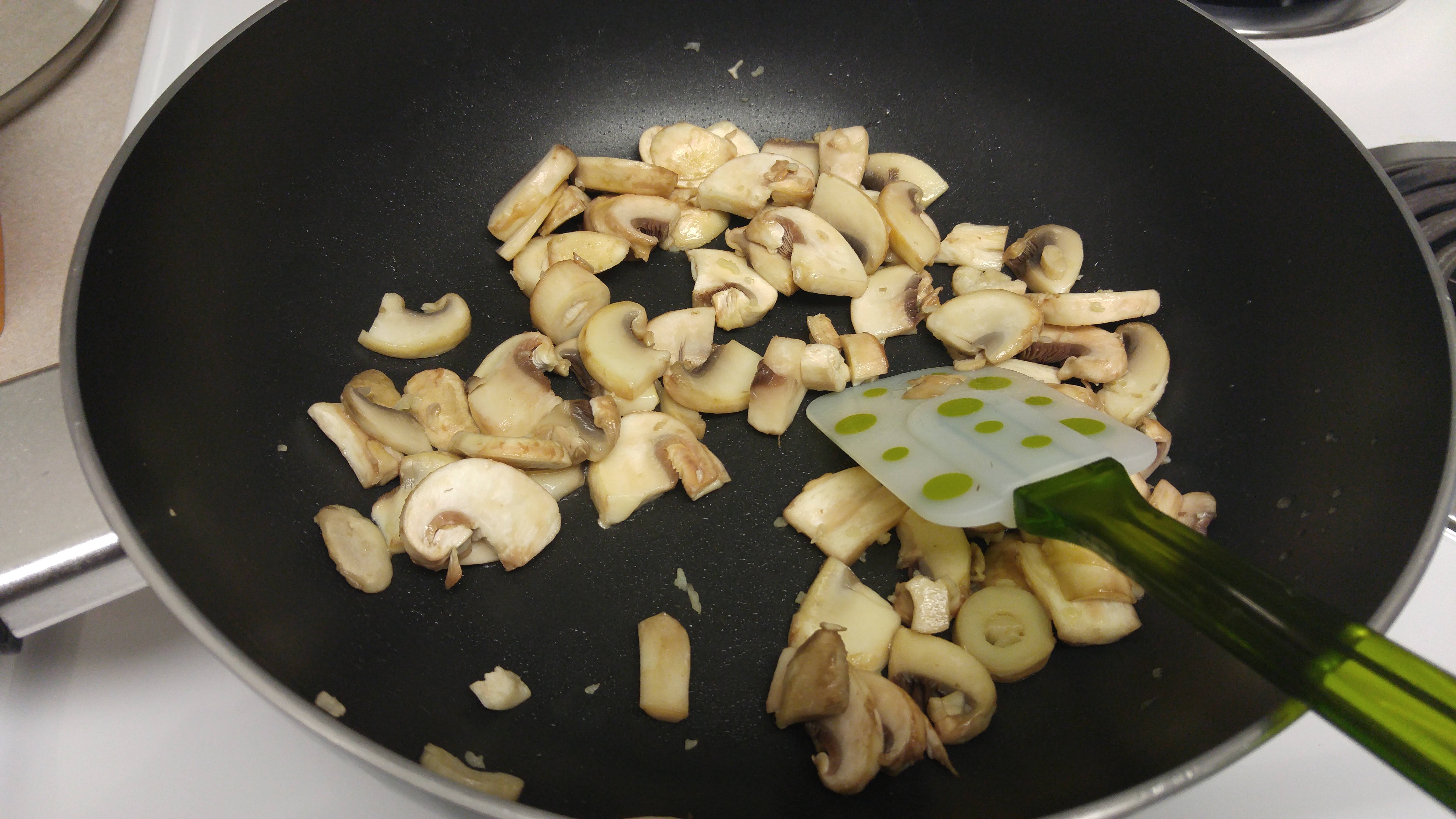 Start by slicing and sautéing 5 mushrooms in dairy-free butter or oil. Browning the mushrooms would bring out the nice earthy flavour.