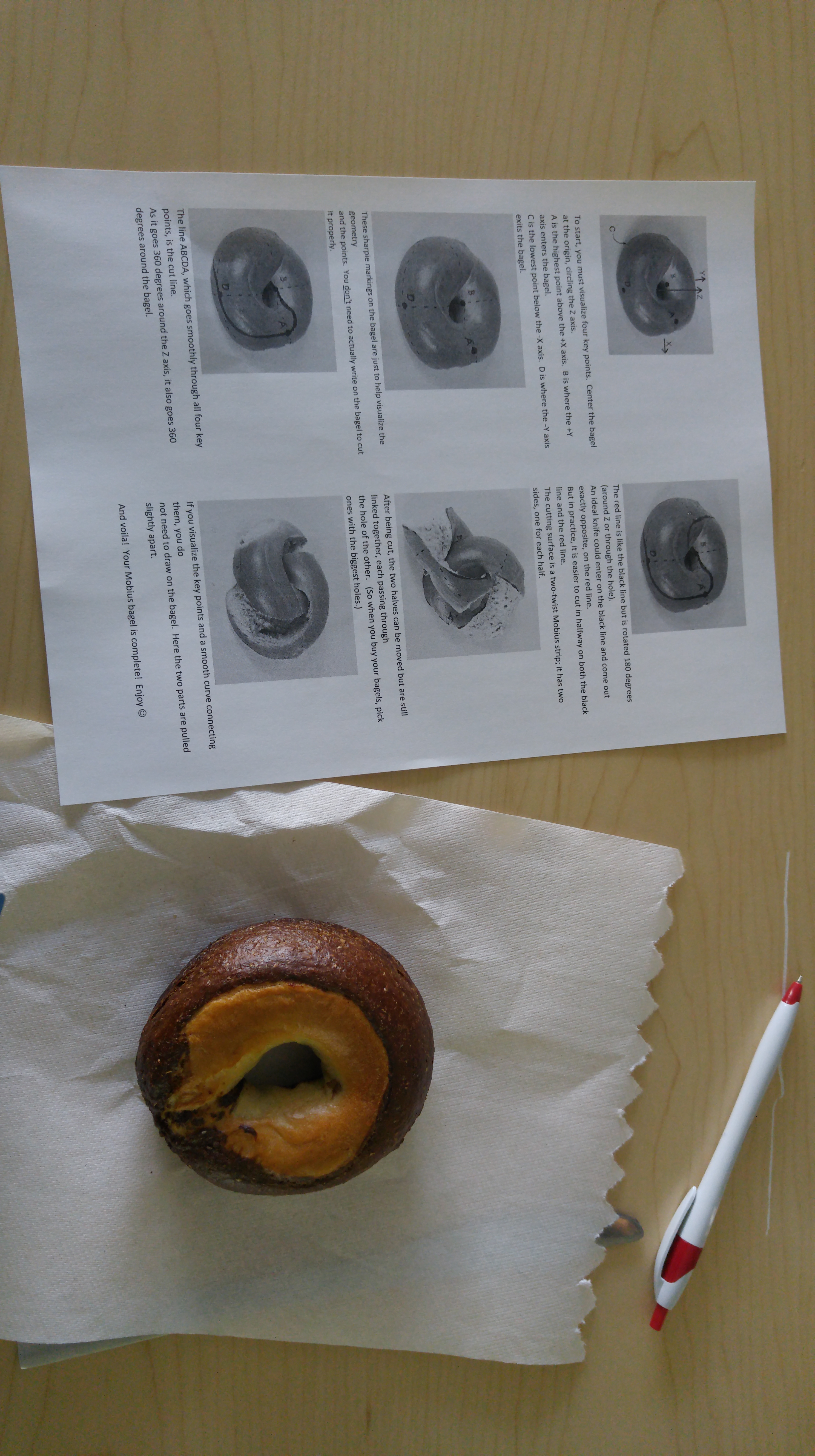“Don’t play with your food” is what went through my mind as I tried to make this mobius bagel. At work we were given instructions to make a bagel into two interlocking loops. It looked easy enough.