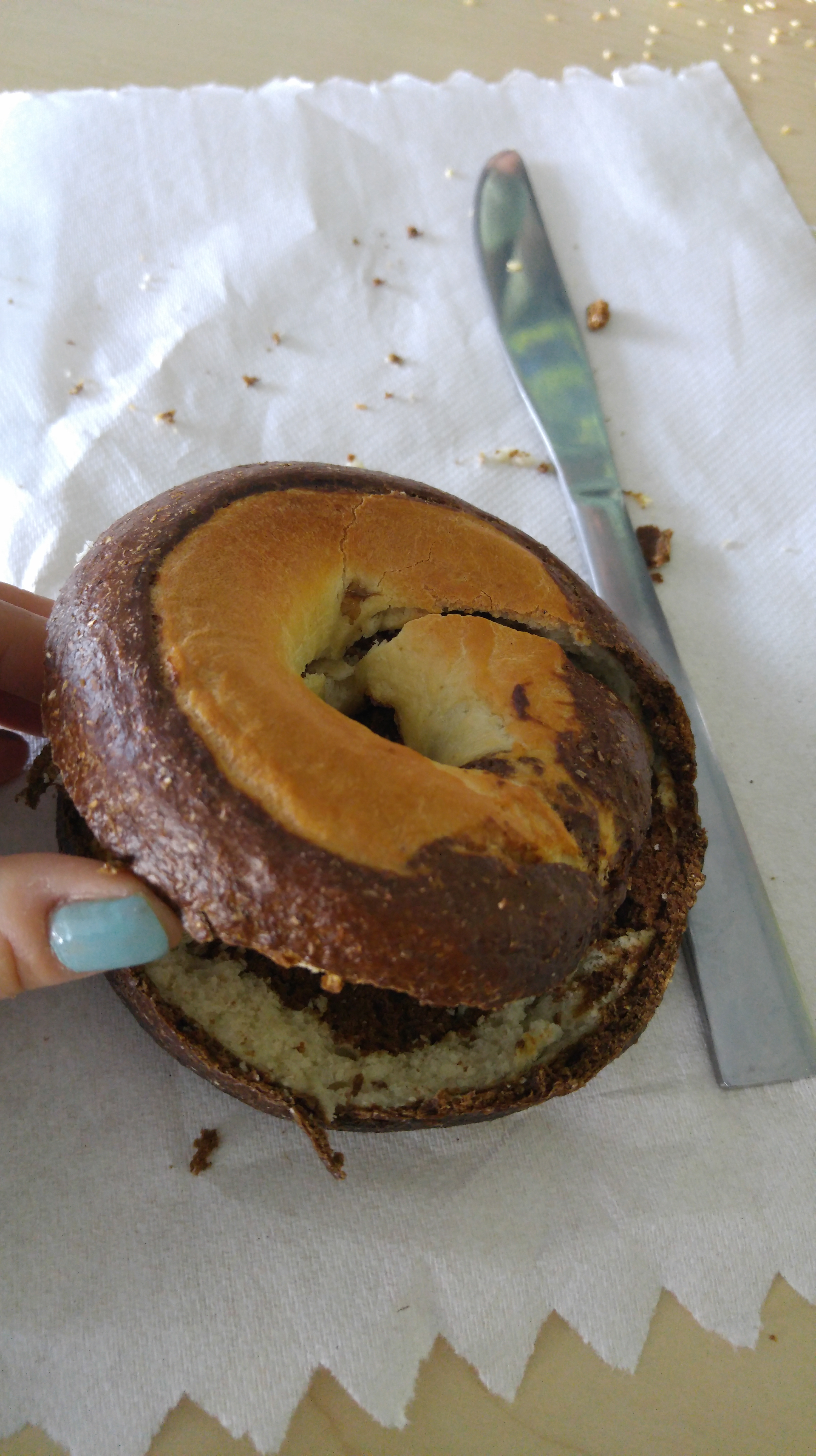 I started cutting the bagel like the video, I grew more and more hopeful.