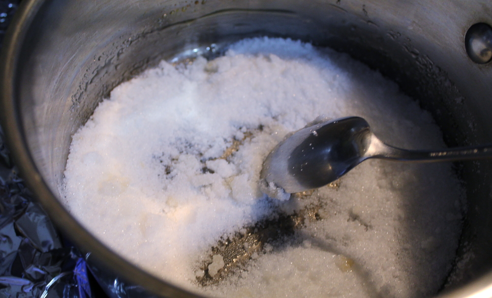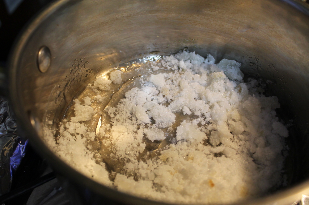 Here comes the experiment. (Sorry there weren’t many pictures. The sugar caramelized really quickly and then burnt before I could do anything about it.) The reason that I tried this was because: 1. I didn’t want to bring a torch to work (I work in a high school and I only have a welding torch), 2. I was serving the creme brulees right after school and I would not have time to make the sugary tops, and 3. the sugar will get soggy when refrigerated. I did search online to see if there are any ways to make this crust without a torch. Most said you can use a broiler, or the back of a hot spoon but I decided to be creative and combine creme de carmel with creme brulee. I first melt some sugar. Well first prepare your working station. I used silicone mats and I also tested one directly on the creme brulee.