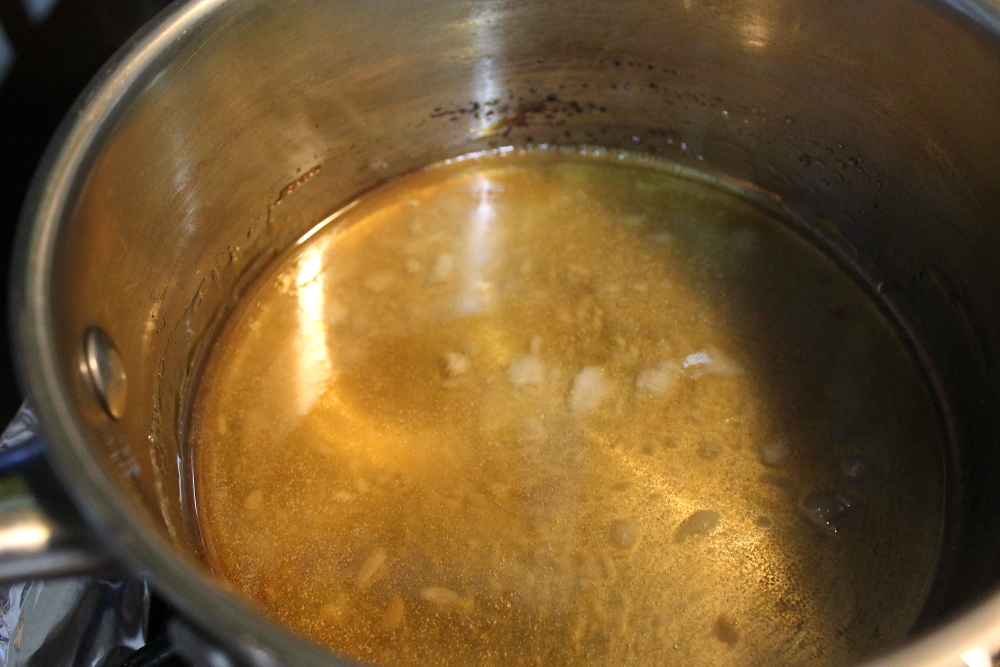 Don’t add any water to the mixture. Stir the sugar until it turns a nice golden color. The picture here is not quite there yet, but you have to work quickly or the sugar will burn. So I didn’t take any picture in between. When the caramel is done, pour some directly onto the cooled brulee. You can set them by placing in the fridge for a couple minutes. To clean the sauce pan, soak in hot water. The sugar will just dissolve.