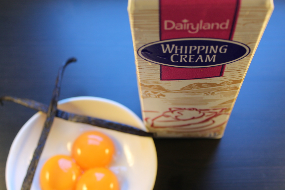 Split the vanilla bean in half with a knife and scrap the seeds out. Add this to the cream in a sauce pan. Bring to a boil, remove from the heat and allow to sit for 15 minutes.