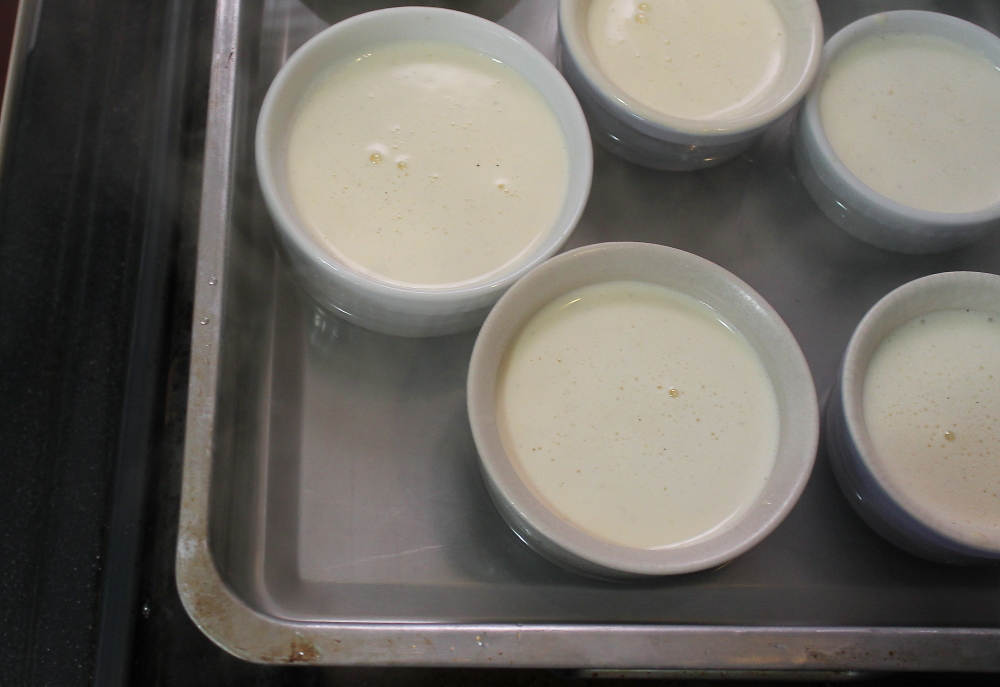 The next step is important because you don’t want to cook the eggs. Add the cream slowly into the eggs mixing and whisk as you do so. I added the cream 1/4 cup at a time. When you are done, pour the cream into ramekins placed in a deep roasting pan. Bring the pan close to the oven before you pour in hot water. Fill the bottom of the pan with enough water so that it comes up about 1/2 way up the sides of the ramekins.