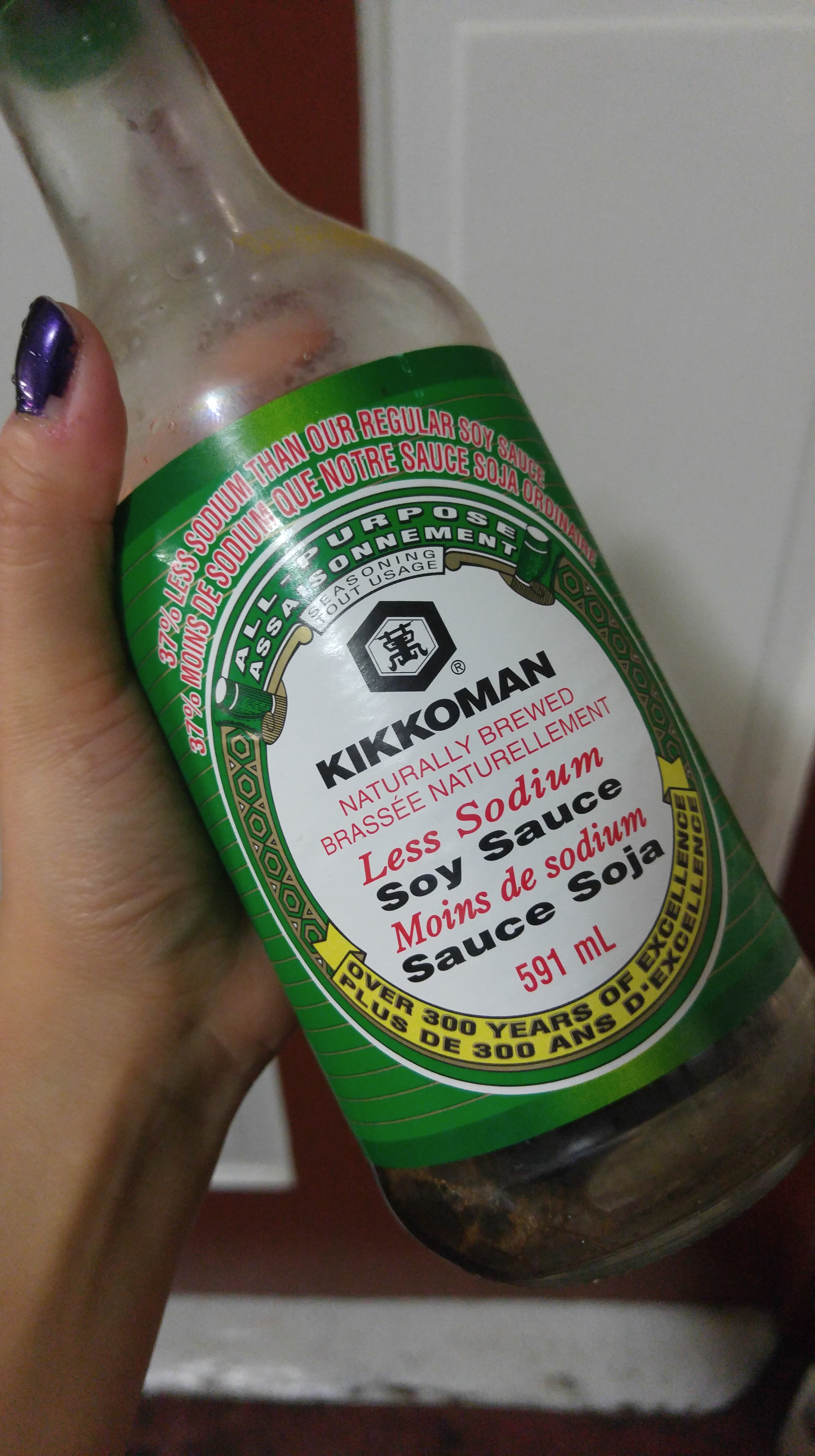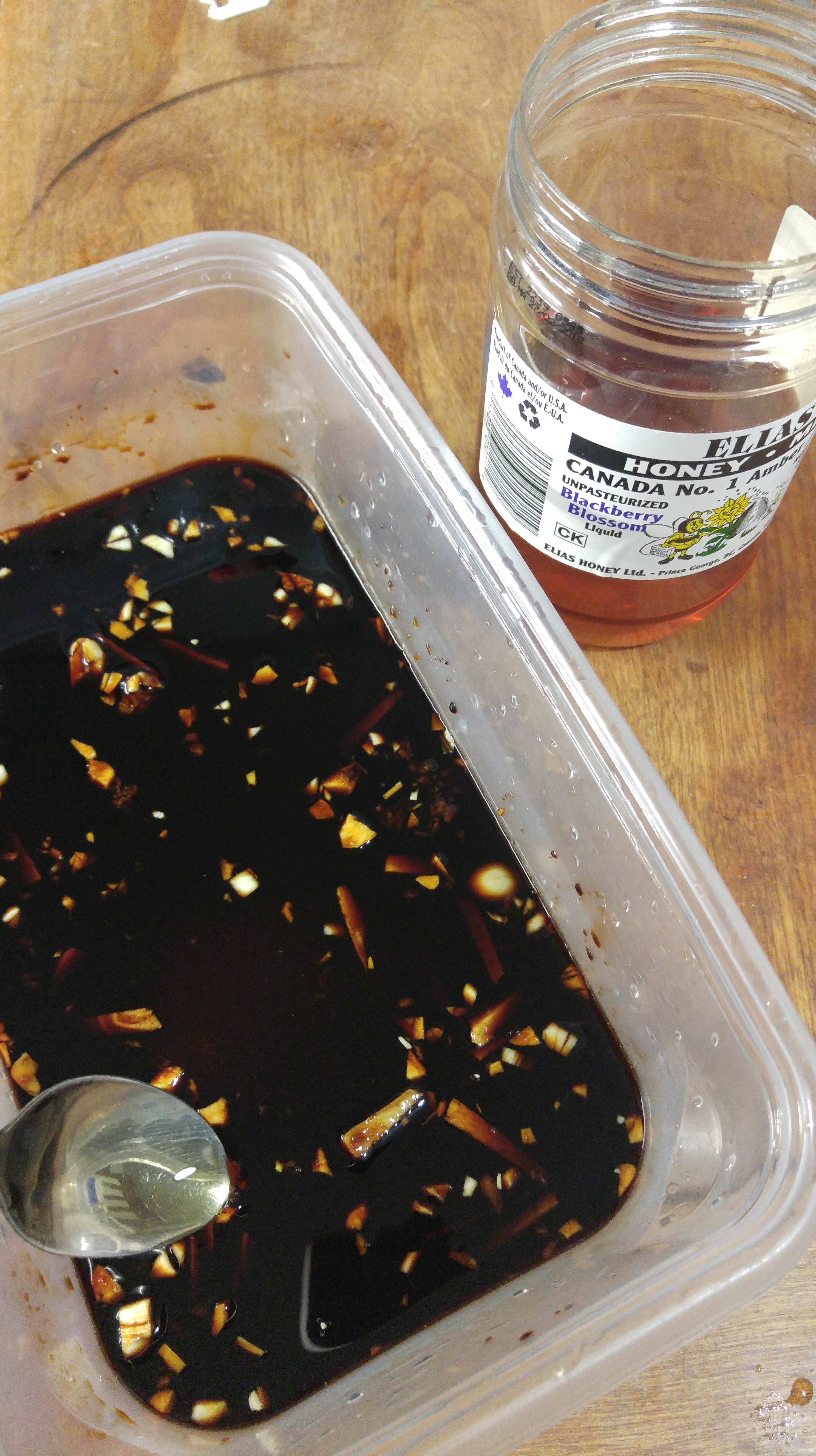 20151102_195337In a container or bowl, measure out 1/4 cup soy sauce. I combined low sodium soy sauce with some dark soy sauce. The dark soy sauce gives a delicious dimension to the dish. Add the ginger, garlic and a teaspoon of honey to the soy sauce.
