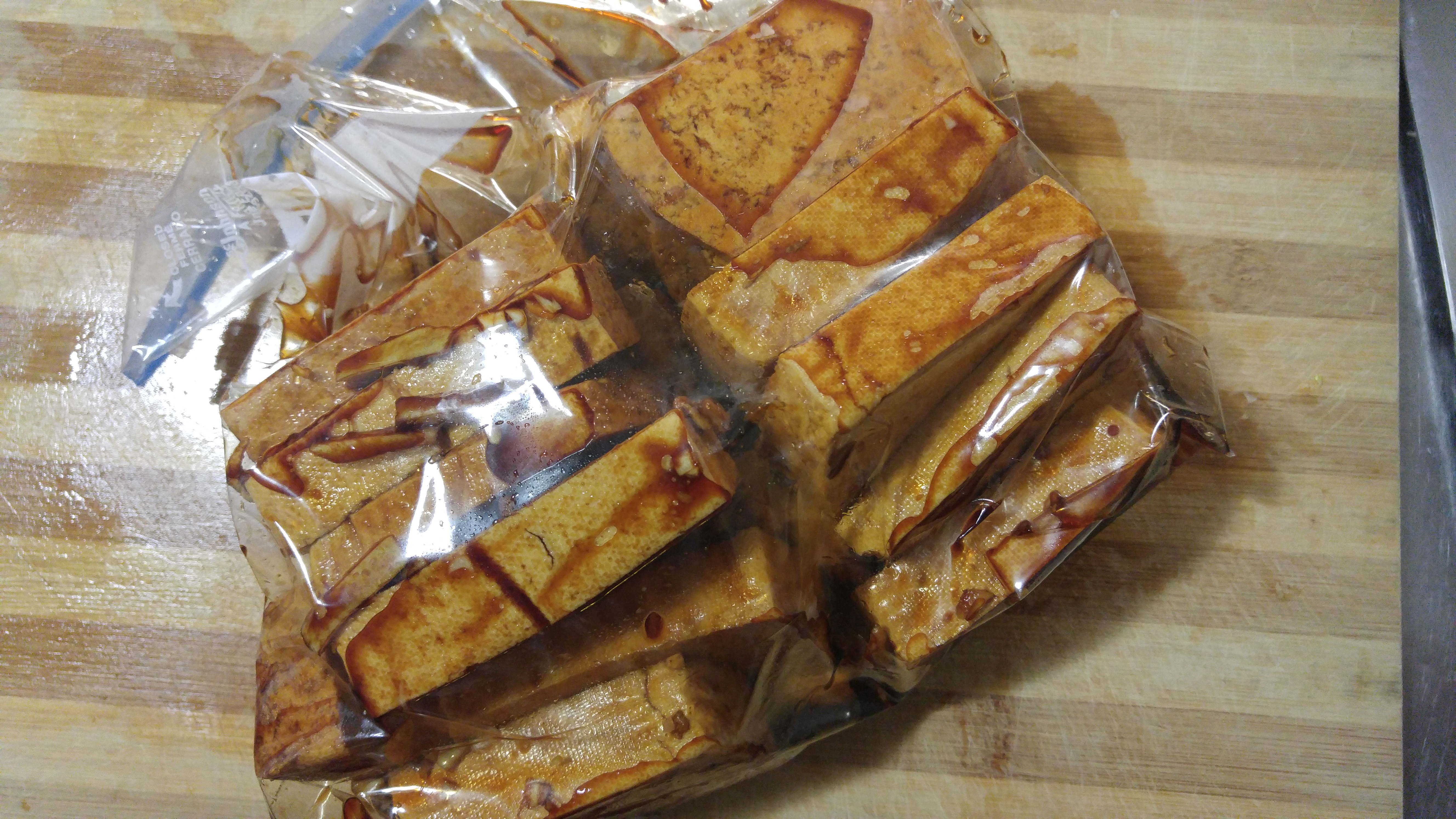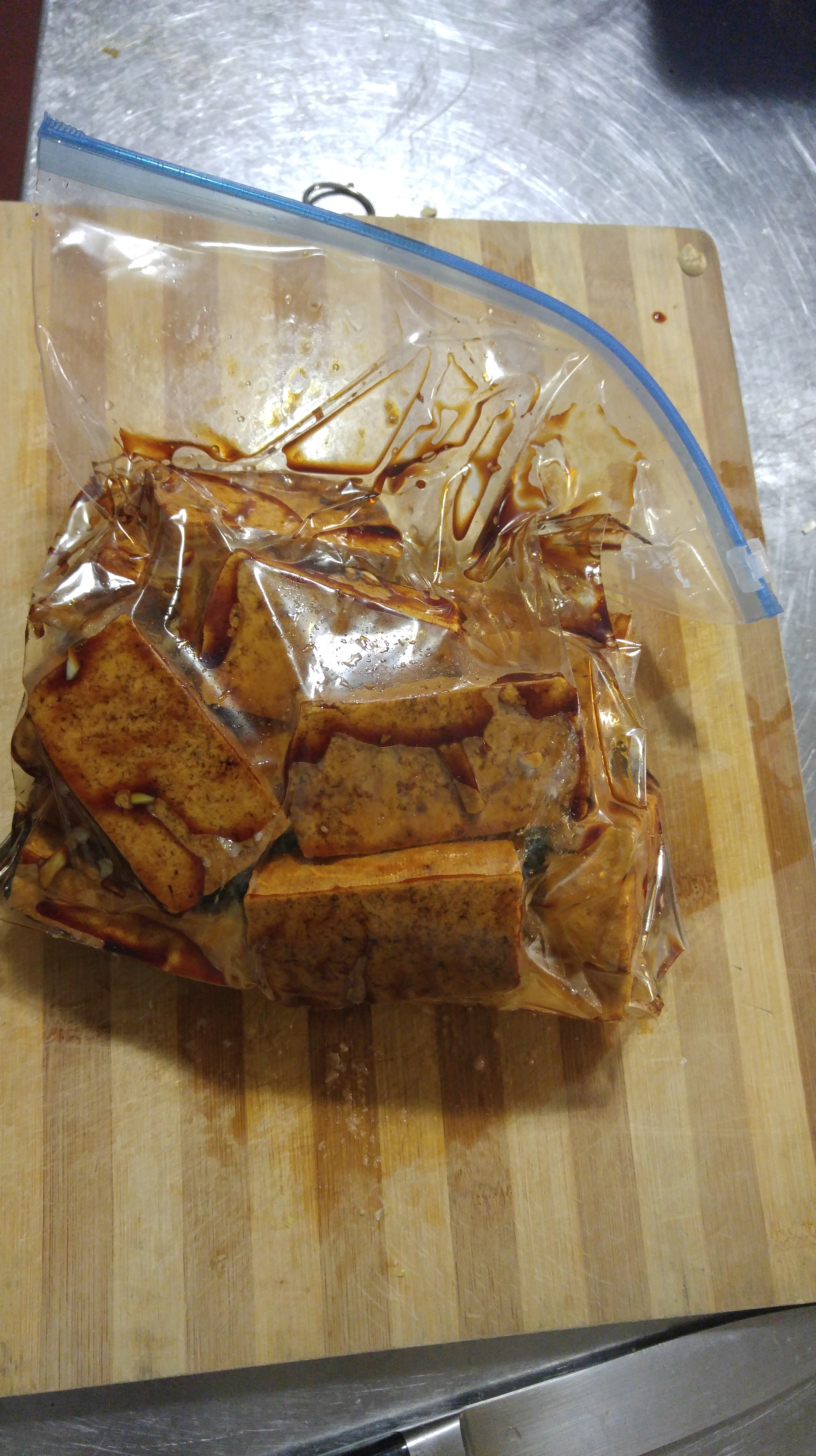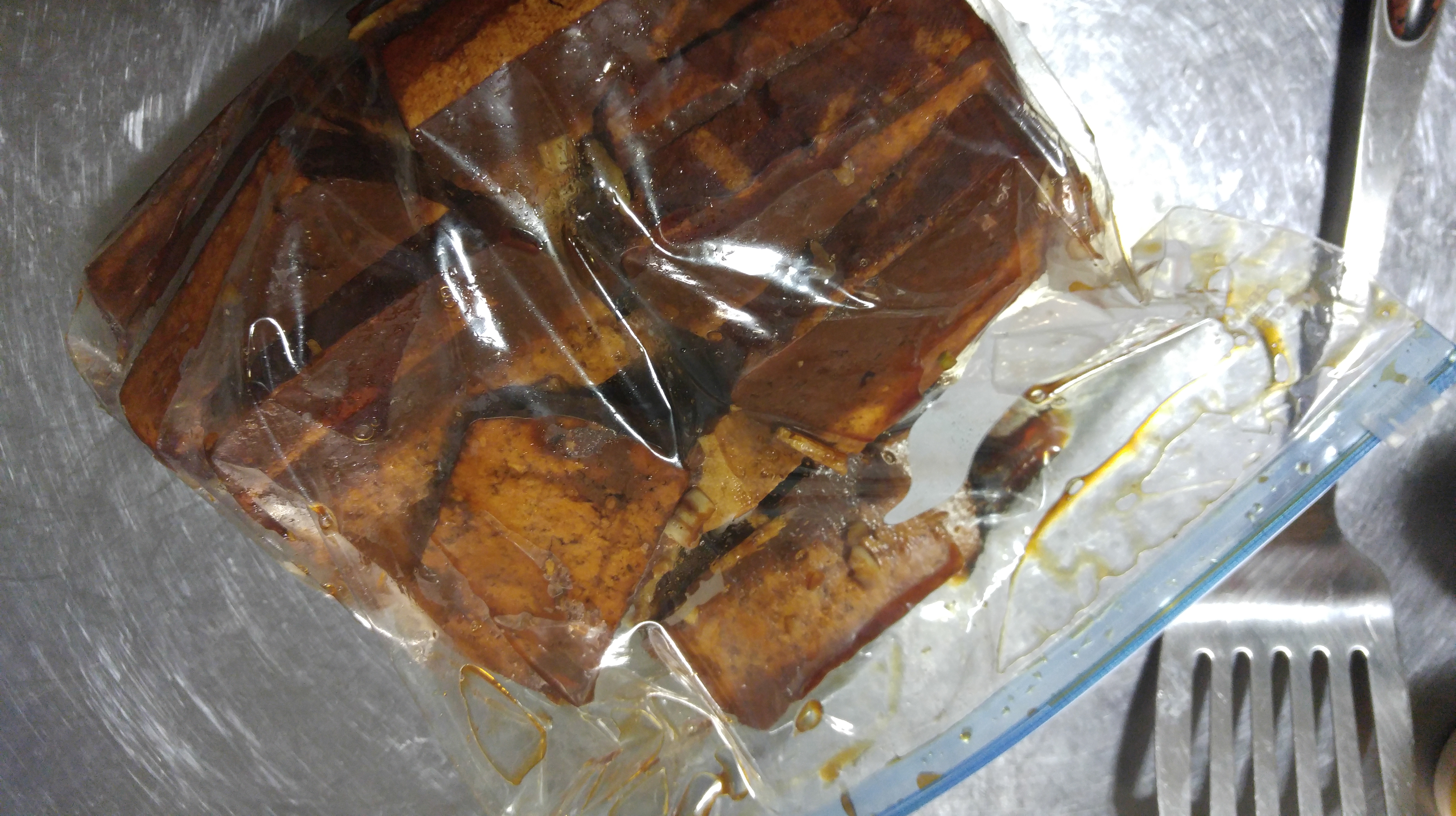 Dunk the tofu into the marinade and then place the whole thing into a ziplock bag.