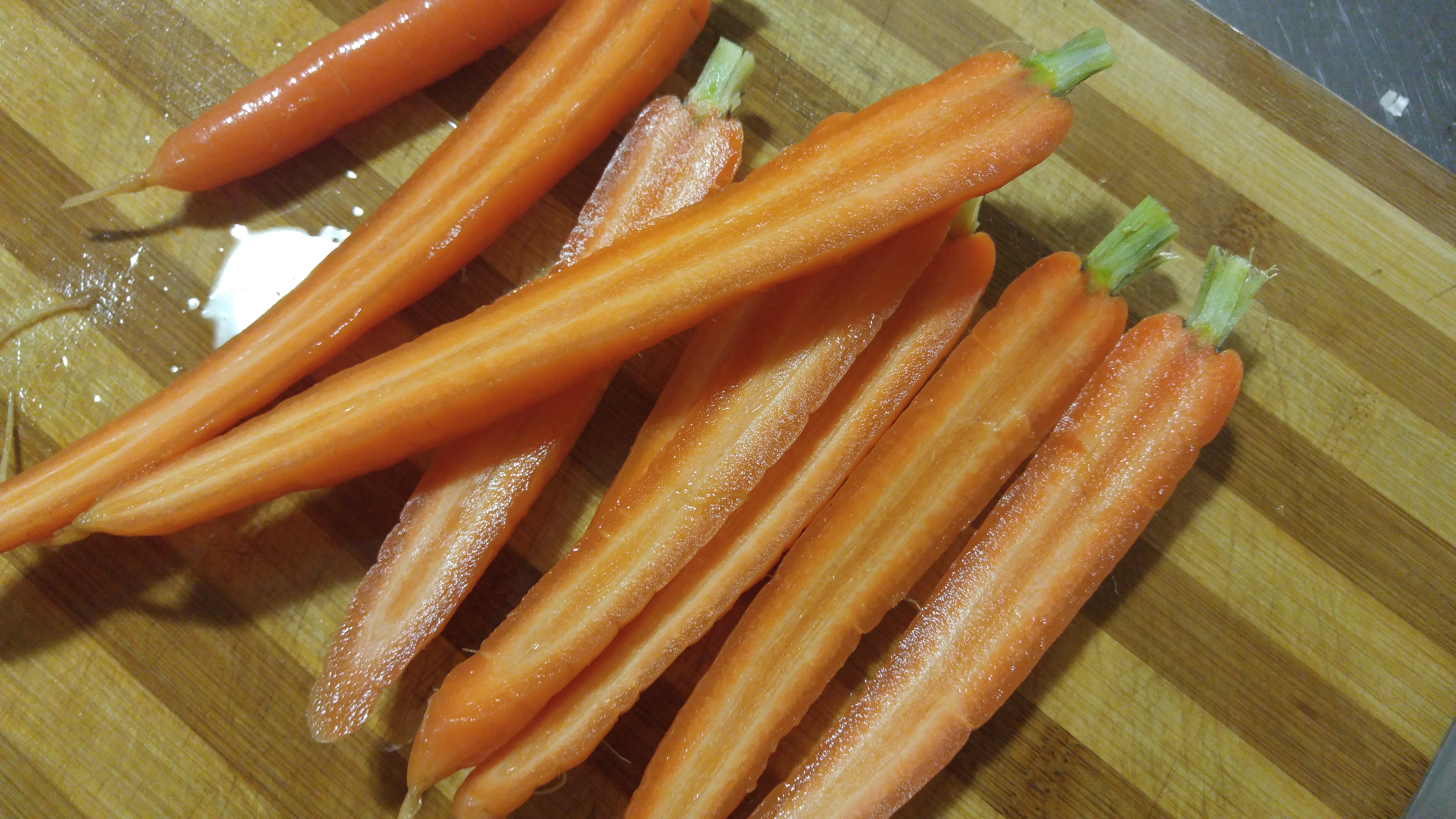 Some carrots would need to be sliced in half to speed up the cooking time.