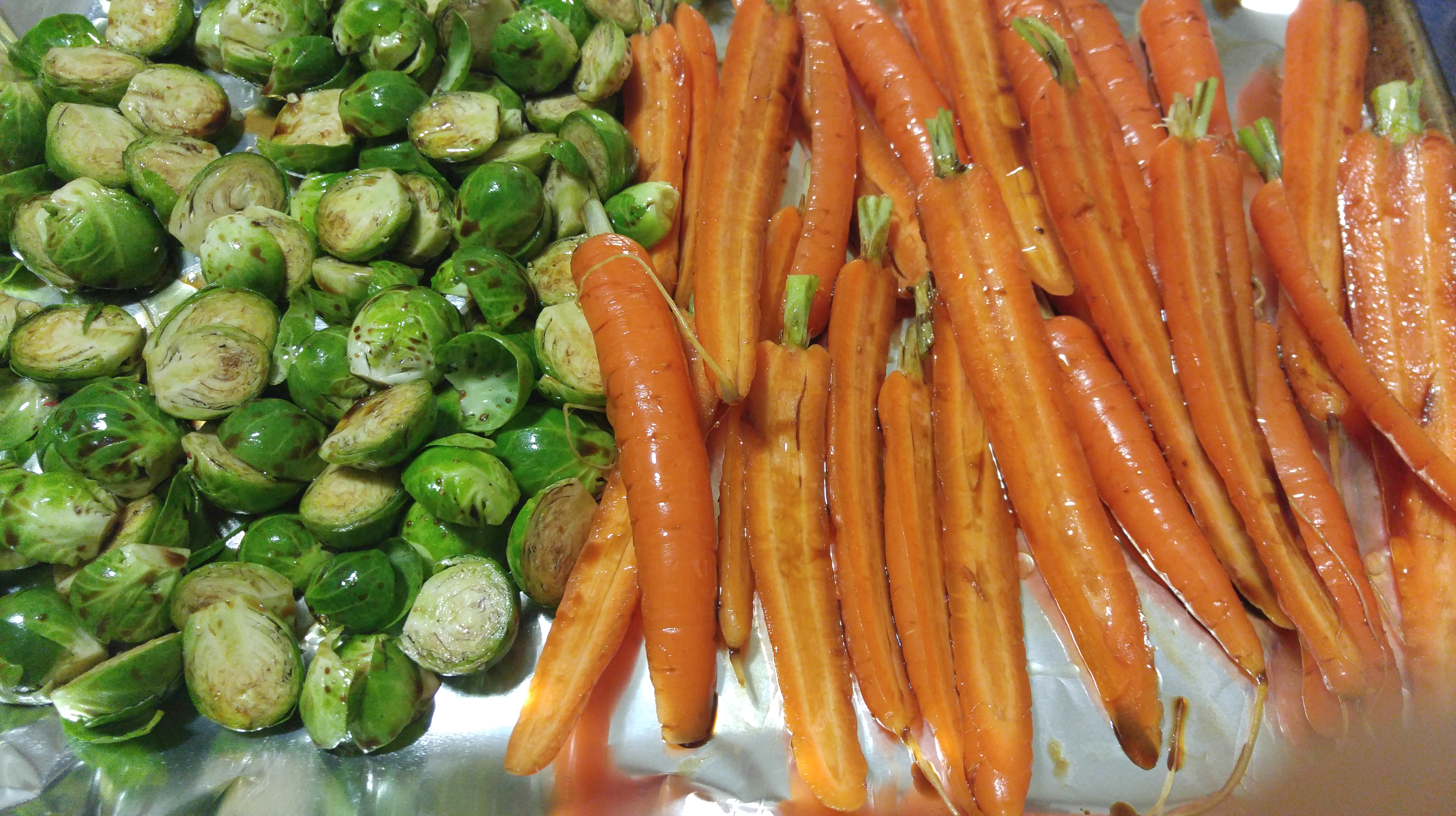 Coat the brussel sprouts and carrots in the dressing. Place them on a baking tray and place in a 400 degree oven. Bake for about 40 minutes or until the veggies are tender.
