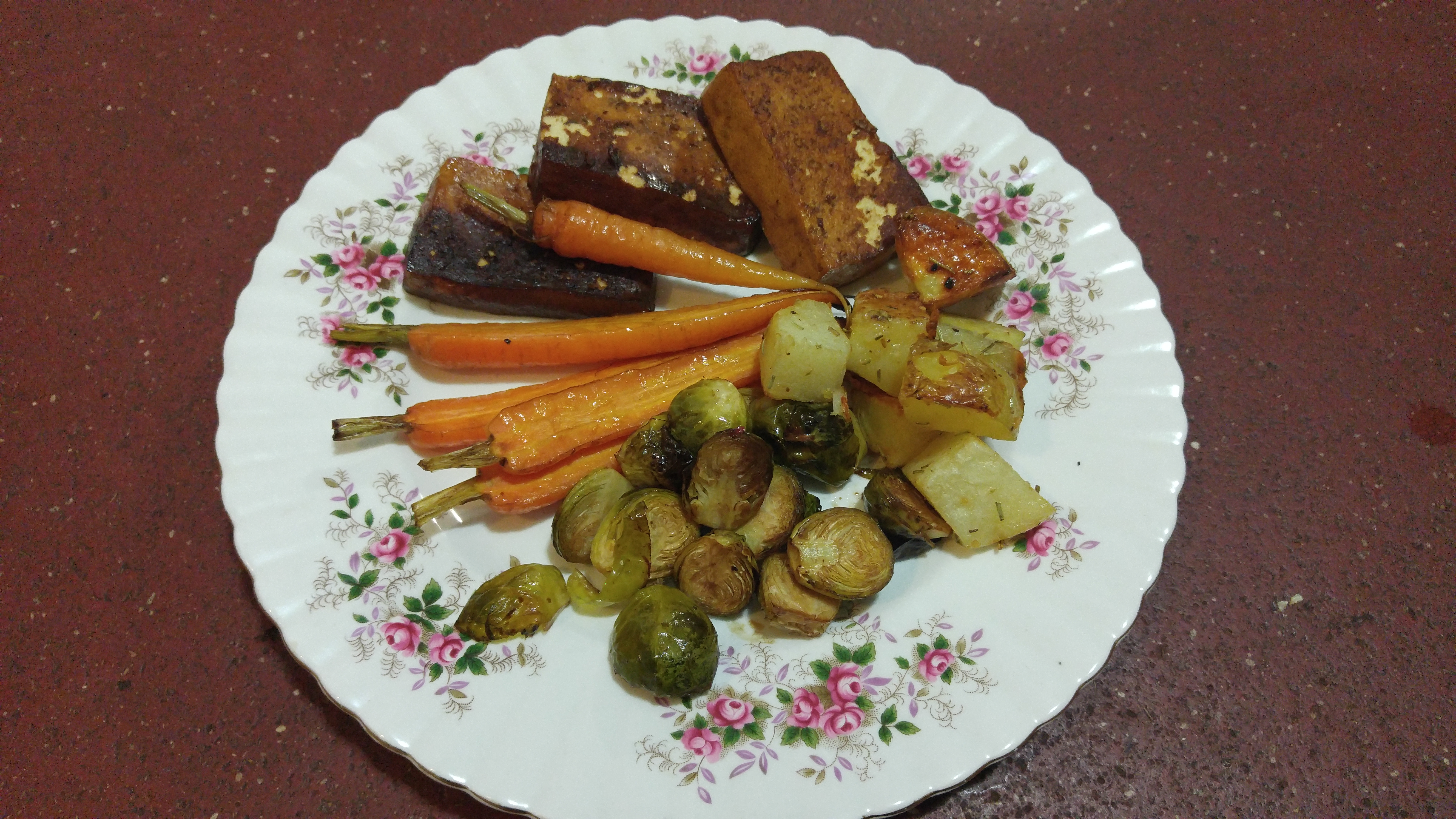 With the tofu ready, potatoes, carrots and brussel sprouts baked. Serve it nice and hot! This makes a perfectly balance meal. Protein, veggies and carbs! All baked and ready in about an hour. Delicious to eat and easy to make. Try this out when you have a craving for tofu or if you have to impress some vegetarian friends!