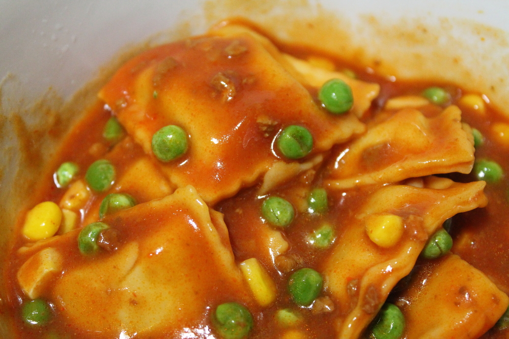 Now to make this even fancier. Add some veggies. Don’t worry, always have some frozen peas and corn in the freezer just in case an unexpected guest comes over. It adds some much needed color. Place the peas and corn into the bowl just before you microwave it. Stir gently so you that do not mush up the noodles.