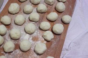 After an hour, portion the dough into small 1 inch balls. Place them on a cutting board and cover with a tea towel. Rest for another 30 minutes. This will make the dough easier to roll out.