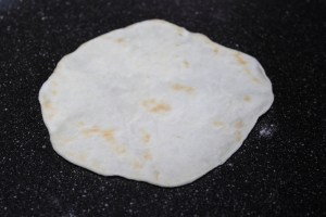 On a floured surface, roll the dough as thin as possible. The dough tends to shrink when it gets pan fried. I also made the balls a lot small because I wanted appetizer sized tortilla wraps. Rolling out the dough took the longest time because I panned fried the tortilla right after I rolled it out. It was just an endless train of rolling and frying. It would be a lot easier to get a tortilla press.