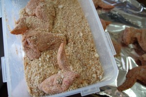I put the mixture in a plastic container. I tossed the chicken in some olive oil and then put a few pieces of chicken in the container. Shake the container and toss to coat the chicken.