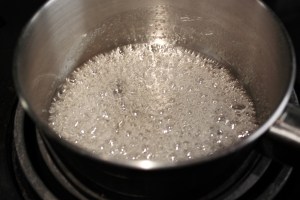 In a saucepan, stir 1/4 cup sugar and 2 Tbsp of water. Cook until the sugar has caramelized. This should take about 8-10 minutes. Just when the sugar is the right colour, add 1 tablespoon of butter.