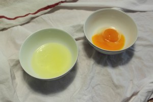 In one mixing bowl, mix 3/4 cup sugar, 8 tablespoons butter and 1 teaspoon vanilla extract. Slowly add 1 yolk at a time and beat. Beat until the batter has turned light and fluffy. In a separate bowl, mix 3/4 cup and 3 tablespoon flour with 3 tablespoons of polenta, 1 1/2 teaspoon of baking powder and 1/4 salt. Next, you will need to mix the flour mixture and milk (3/4 cup) in 3 alternating parts. Start with 1 part of flour and when that is blended, add 1 part milk. Do this until all the milk and flour is mixed