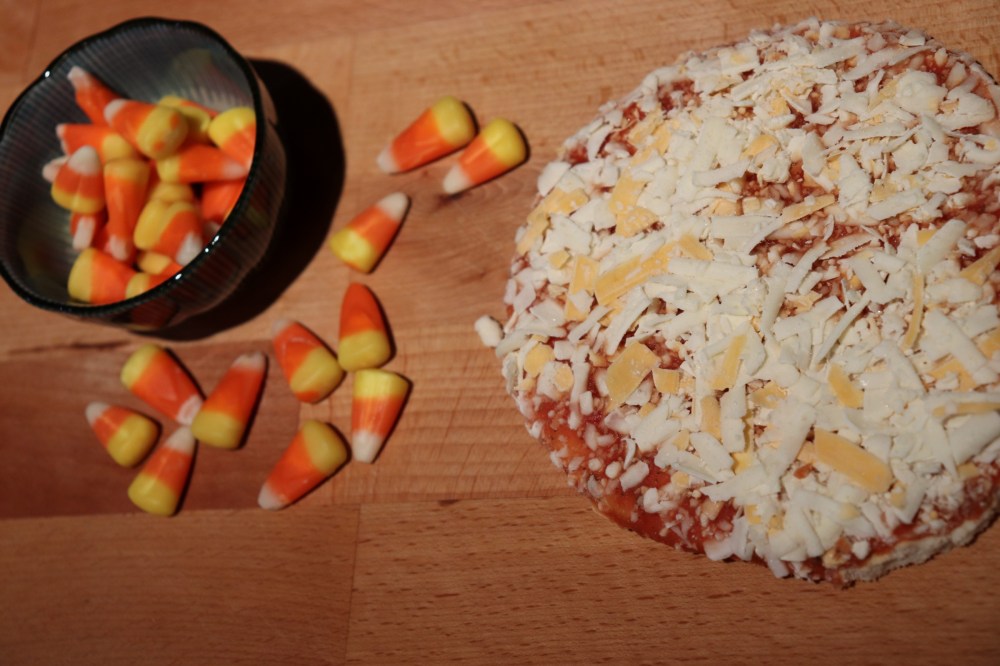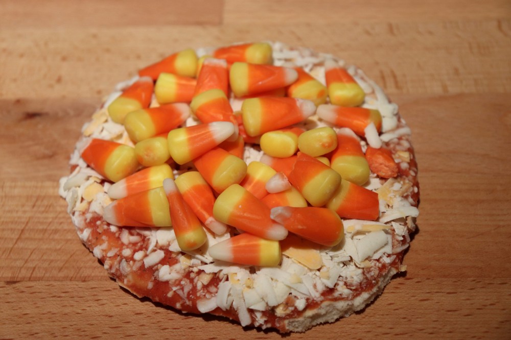 Luckily, I found some candy corn and individual frozen cheese pizza. I added the candy corn and baked it. The candy corn melted and oozed everywhere. The finished pizza did not look very appetizing. I cut a slice and tried a bite.