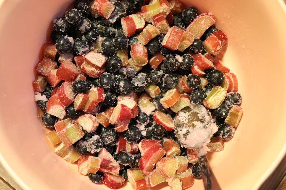I am a big believer of clearing out your freezer after a couple of weeks. You don’t want to keep things in there too long because they will lose their taste and will get frost bite. Currently in my freezer, there was a large bag of rhubarb and a large bag of blueberries. The other thing I had was sour cream. I wanted to make something that would use up these items and I found the perfect recipe!! Blueberry and rhubarb streusel!