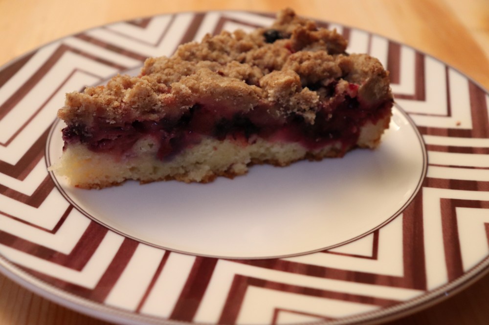 Recipe from https://motherwouldknow.com/blueberry-rhubarb-streusel-cake/
