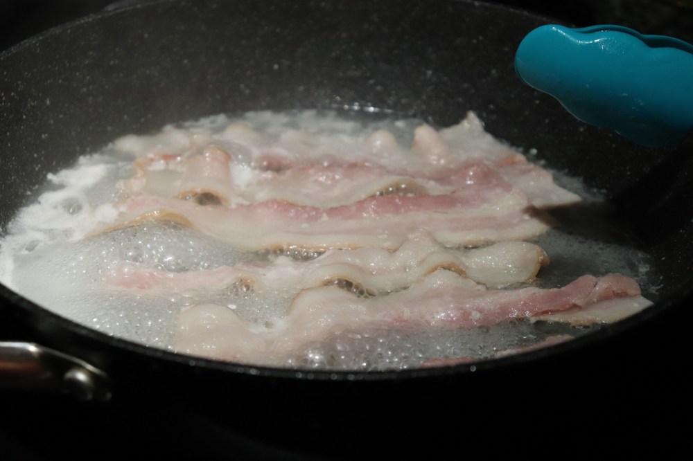 One of my favourite breakfast combos are eggs and bacon. Pan fry the bacon to your liking. I like mine just crispy and with some chew.